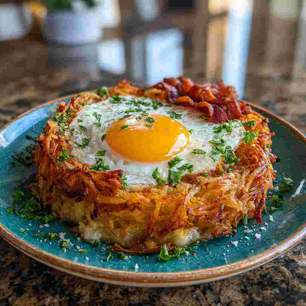 Serve them warm on a plate with fresh herbs. It is helpful to provide guests with a sharp knife so they can easily cut through the crispy potato layers and let the egg yolk create a natural sauce for the dish.