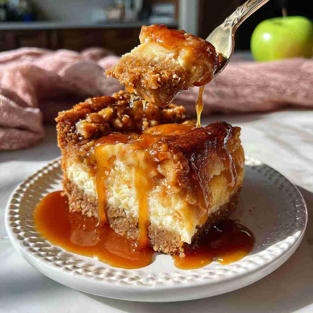 Granny Smith apples are the best choice because their tartness balances the sweet caramel and cheesecake, and they hold their shape well during baking. You can also use Honeycrisp or Braeburn apples.