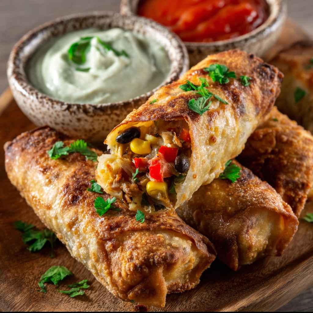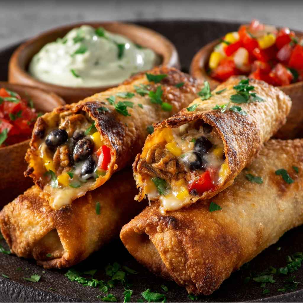 These eggrolls are best served warm with the signature avocado cream sauce. For a full restaurant-style spread, serve them alongside pico de gallo, fresh guacamole, or a roasted poblano chili corn salsa. They make a fantastic appetizer for game days, but they can also be served as a main course when paired with a side of Mexican rice and refried beans.