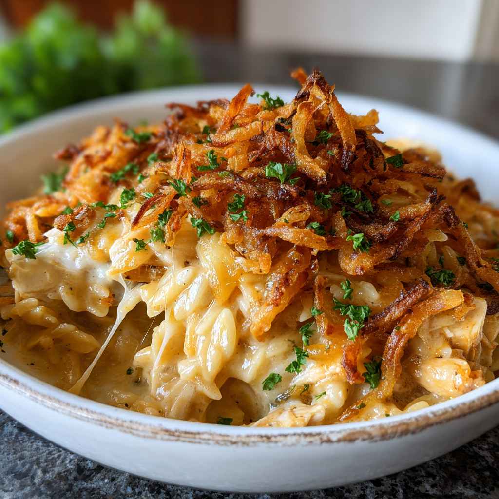 French Onion Chicken Orzo Casserole
