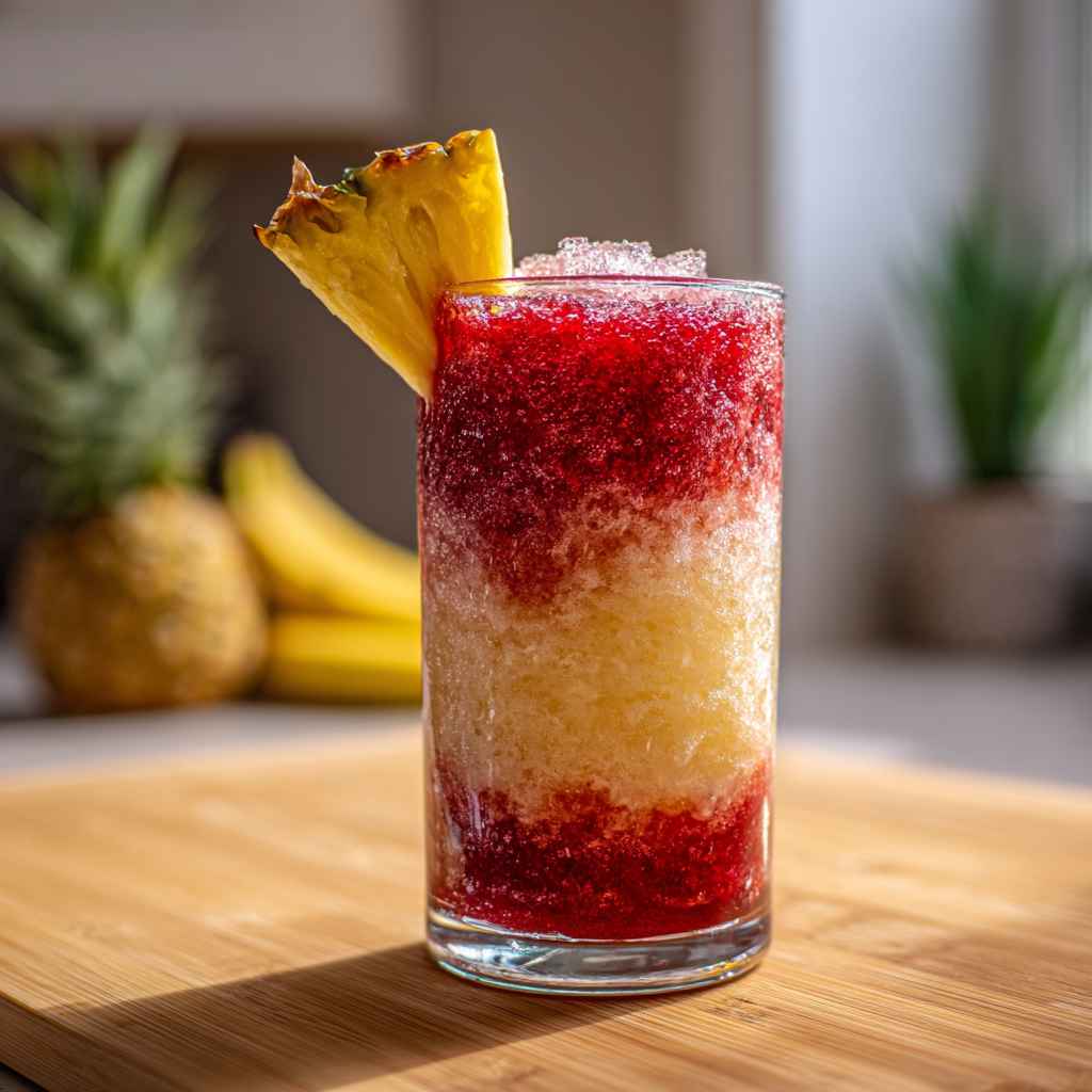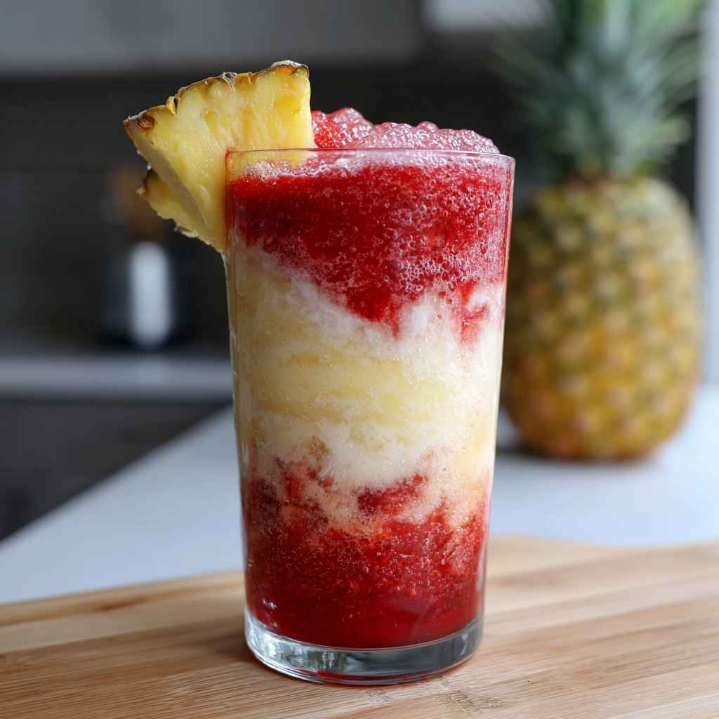 This drink is best served in a tall hurricane glass to showcase the beautiful red and white swirls. For a truly festive presentation, add a small paper umbrella and a straw. This beverage pairs wonderfully with tropical-inspired appetizers like coconut shrimp, fresh fruit skewers, or Hawaiian pulled pork sliders. If you are serving this at a party, you can pre-make the strawberry puree and store it in the refrigerator, then blend the coconut base right as guests arrive to ensure the texture is perfectly frozen.
