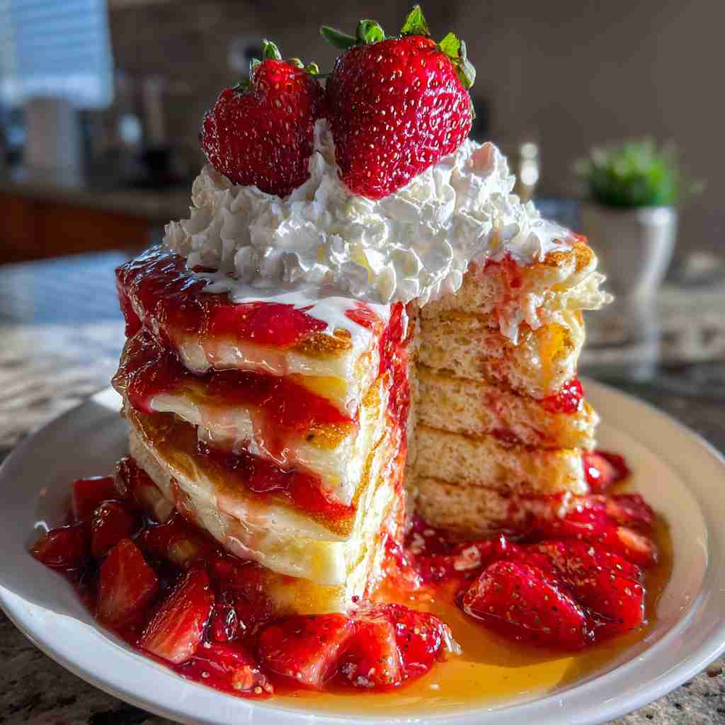 These fluffy strawberry pancakes are soft, golden, and bursting with