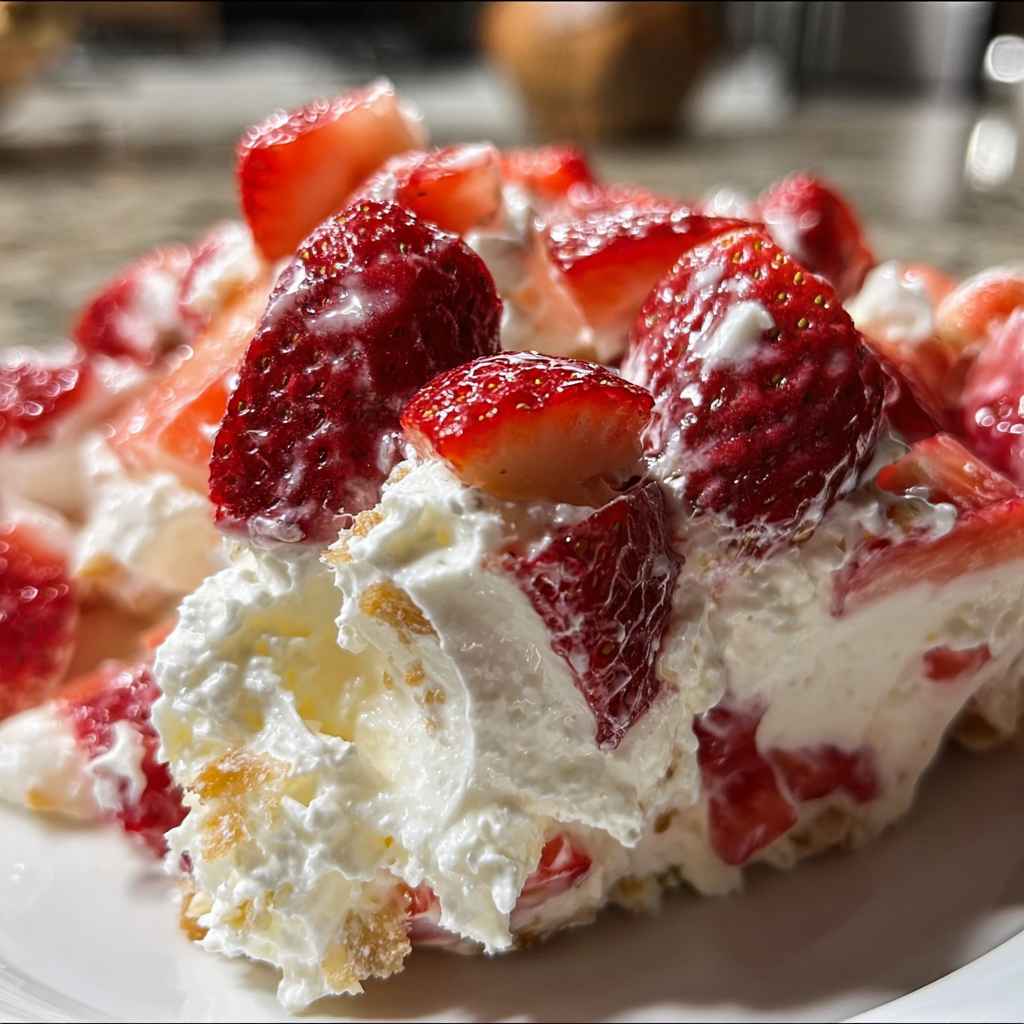 This dessert is best served in a large, clear glass trifle bowl to showcase the vibrant red strawberries and the creamy base. For a more elegant presentation at a dinner party, you can scoop the mixture into individual parfait glasses or martini glasses. It pairs wonderfully with a cup of coffee or a cold glass of milk. If you are serving this at an outdoor event, keep the bowl nestled in a larger bowl of ice to ensure the cream cheese base stays chilled and food-safe.