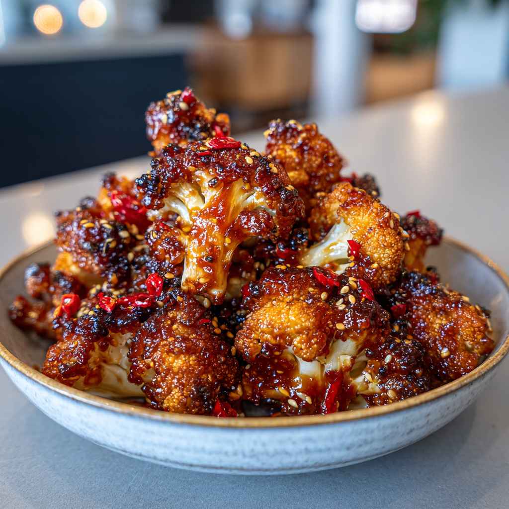 - Pour the thickened sauce over the cauliflower and toss until fully coated, then garnish with sliced green onions and sesame seeds before serving.1 tablespoon Green Onions, 1 tablespoon Sesame Seeds